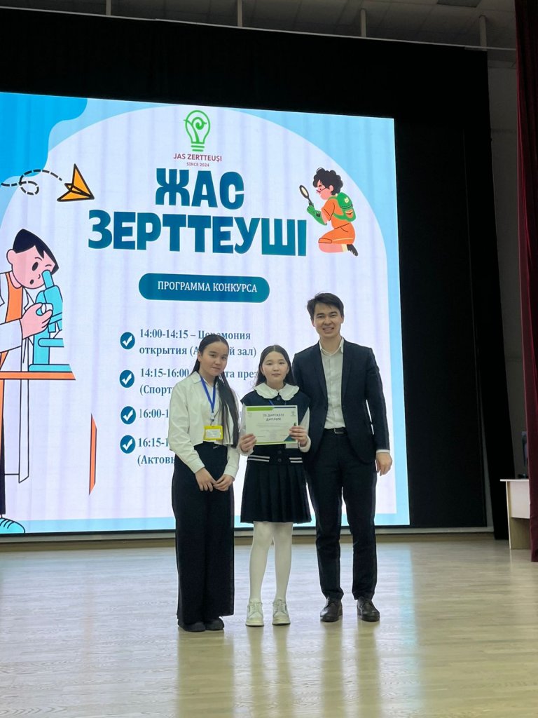 2026 жылдың 20 ақпанында Астана қаласындағы Назарбаев Зияткерлік мектебінің ұйымдастыруымен өткен «Жас зерттеуші» ғылыми-зерттеу байқауы барысында оқушыларымыз ерекше жетістіктерге жетті. Бұл байқаудың басты мақсаты – 7-сынып оқушыларының ғылыми ойлауын, шығармашылық қабілеттерін дамыту және ғылыми ізденіске деген қызығушылықтарын арттыру. Байқау түрлі ғылыми бағыттар бойынша өткізілді, оның ішінде химия, физика, биология, этномәдениет, информатика, робототехника және STEM салалары қамтылды.